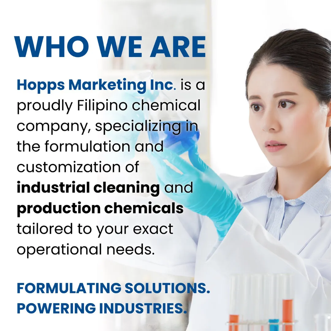 At Hopps Marketing Inc., we stand proudly as a 100% Filipino solutions provider—delivering locally formulated industrial chemicals, cleaning essentials, and production materials built to meet real operational demands. We understand the challenges businesses face: strict regulations, costly import delays, and the need for dependable, compliant products. That’s why we exist—to remove those barriers.